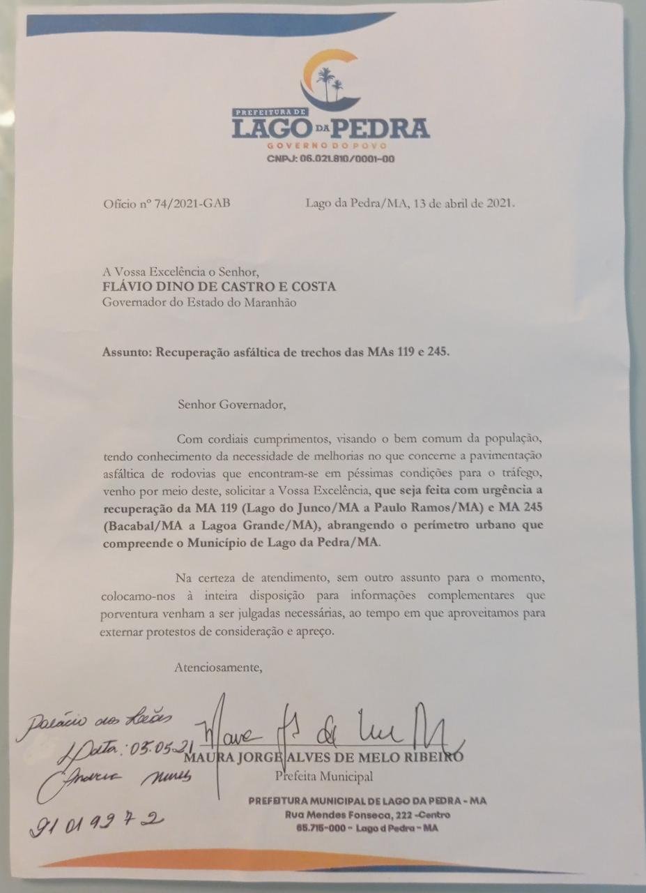 A prefeita Maura Jorge solicitou, junto ao governo do estado, que fosse realizada a recuperação de trechos de rodovias estaduais que ligam Lago dos Rodrigues a Paulo Ramos e Bacabal a Lagoa Grande, ambos passando pelo perímetro urbano de Lago da Pedra, cidade da qual é gestora.