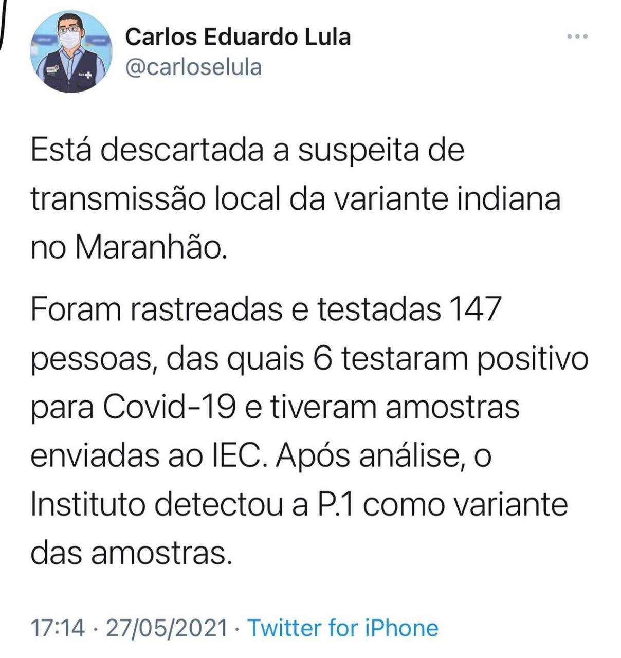 “Está descartada a suspeita de transmissão local da variante indiana no Maranhão. Foram rastreadas e testadas 147 pessoas, das quais 6 testaram positivo para Covid-19 e tiveram amostras enviadas ao IEC. Após análise, o Instituto detectou a P.1 como variante das amostras.”