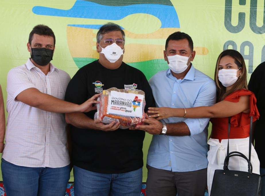 Durante a cerimônia, Glalbert, ao lado do governador Flávio Dino (PCdoB), realizou a entrega simbólica aos municípios de Olinda Nova do Maranhão, contemplado com 563 cestas básicas, ao município de São João Batista, que recebeu 786 cestas e ao município de São José de Ribamar, contemplado com 6.803 cestas.