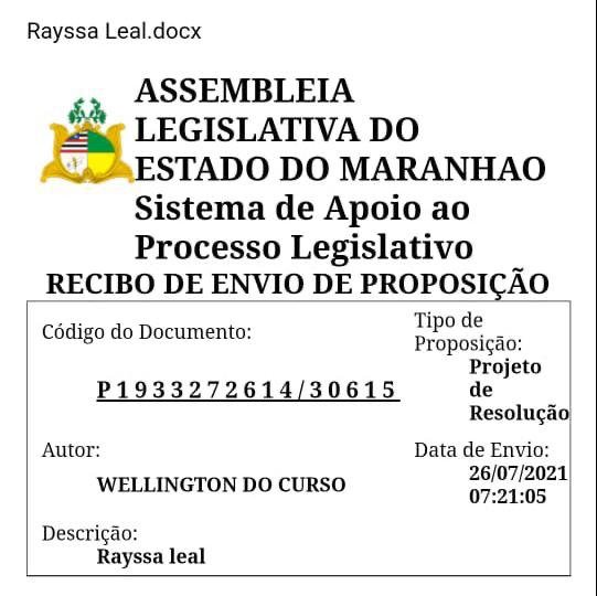 Atualmente, tramita na Assembleia Legislativa um Projeto de Resolução que concede a Medalha de Mérito Legislativo à maranhense Rayssa Leal. A proposta é de autoria do deputado Wellington. Além disso, o parlamentar também encaminhou uma moção de aplausos à atleta maranhense.