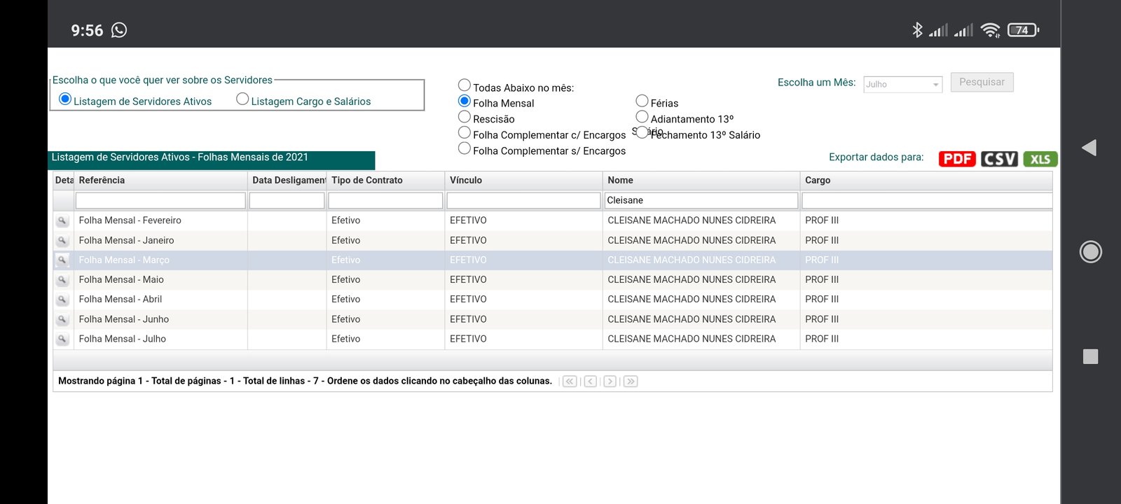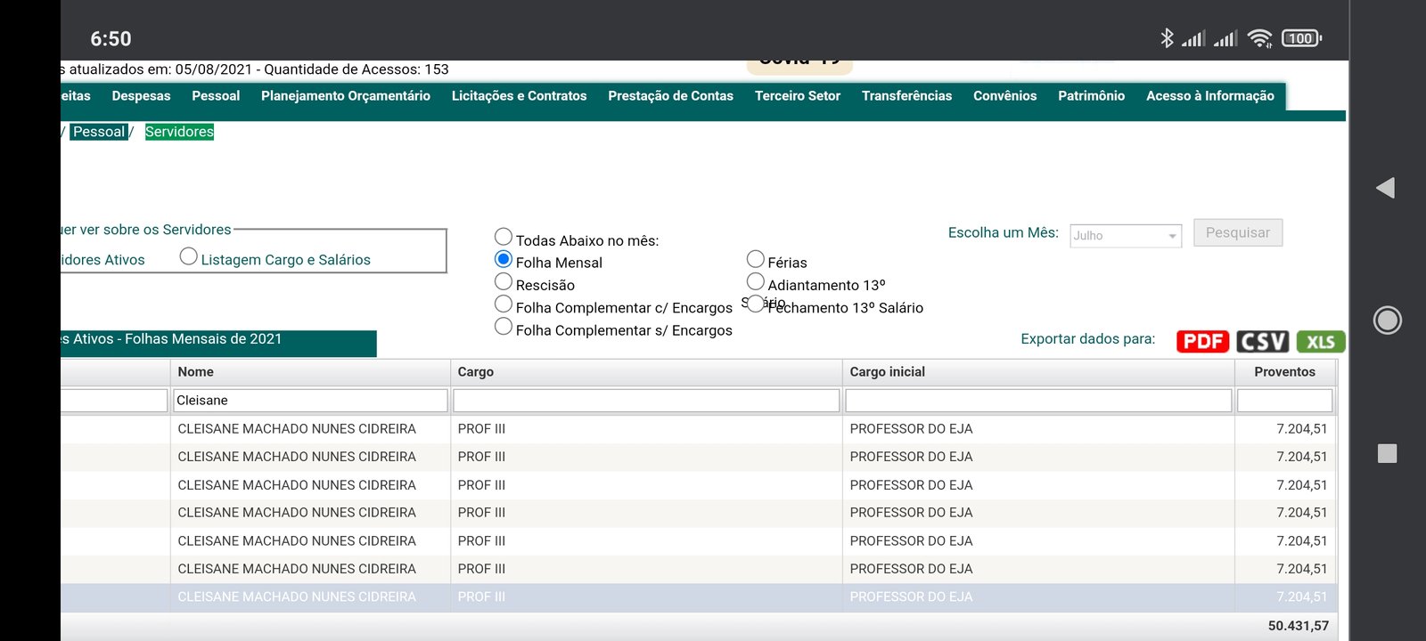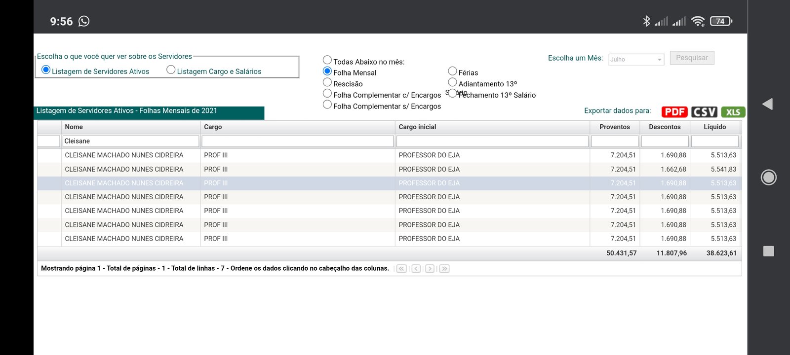 A esposa do prefeito Carrinho Cidreira, da cidade de Viana, recebeu no mês de julho, em folha de pagamento o valor de R$7.204,51. Com cargo de Professora do EJA (Educação Jovens e Adultos).