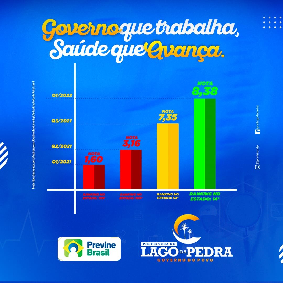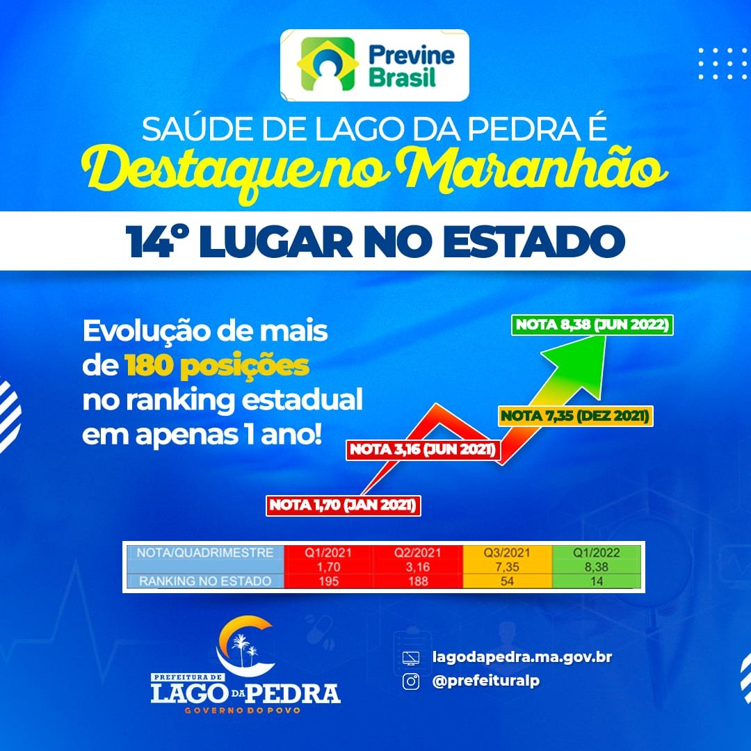 lugar, na avaliação dos indicadores do Programa Previne Brasil, do Ministério da Saúde. A cidade, comandada pela prefeita Maura Jorge, alcançou nota 8,39 no Indicador Sintético Final – ISF, evolução de mais de 180 posições no ranking estadual em apenas um ano.