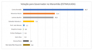 O levantamento foi realizado entre os dias 11 e 15 de agosto em São Luís e mais 58 cidades do Maranhão. Na disputa pelo Palácio dos Leões estão nove candidatos: Carlos Brandão (PSB), Edivaldo Holanda Jr. (PSD), Enilton Rodrigues (PSOL), Hertz Dias (PSTU), Joás Moraes (DC), Lahésio Bonfim (PSC), Simplício Araújo(Solidariedade), e Weverton Rocha (PDT).