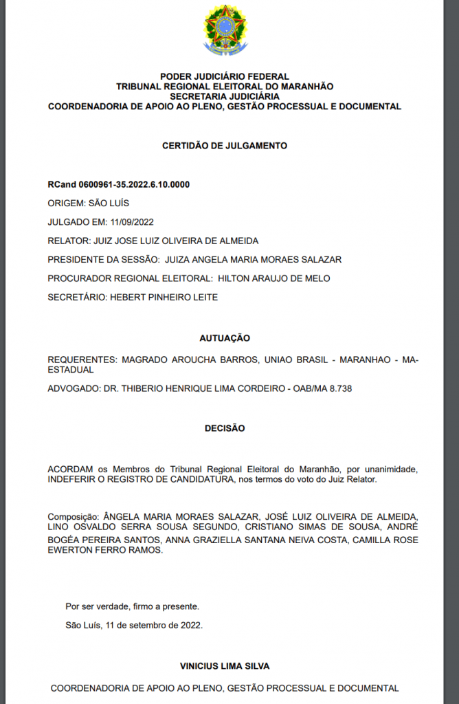 Ontem, ao julgar o caso, os membros do TRE reconheceram a inelegibilidade de Magrado, que concorre ao cargo de deputado federal pelo União Brasil. O relator do processo, juiz Lino Sousa, entendeu que o candidato não estava com sua quitação eleitoral. “Acordam os Membros do Tribunal Regional Eleitoral do Maranhão, por unanimidade, indeferir o registro de candidatura, nos termos do voto do juiz relator”, diz a decisão.