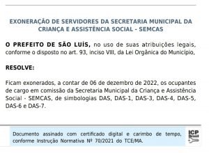 O prefeito de São Luís, Eduardo Braide (PSD), assinou nesta terça-feira, 6, um ato exonerando todos os servidores comissionados da Secretaria Municipal da Criança e Assistência Social.