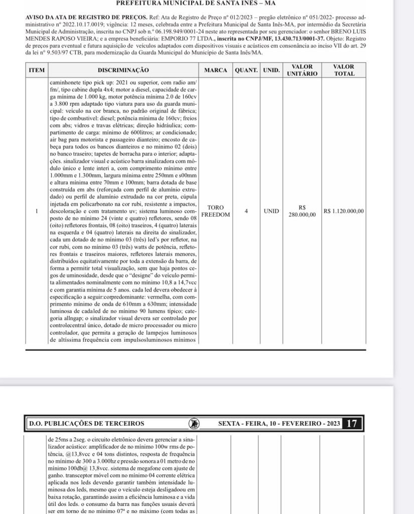 Já na Emporio Distribuidora, o mesmo carro vai ser adquirido pela prefeitura de Santa Inês pela bagatela de R$ 280 mil.