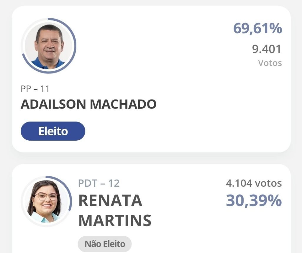 Adailson Machado teve 69,61% dos votos dados a todos os candidatos. Em segundo lugar ficou Renata Martins, com 30,39%. Veja a lista de candidatos a vereador mais votados.