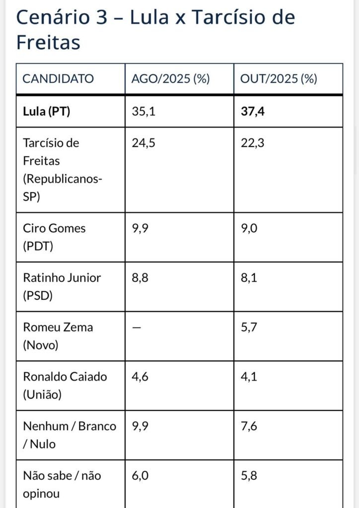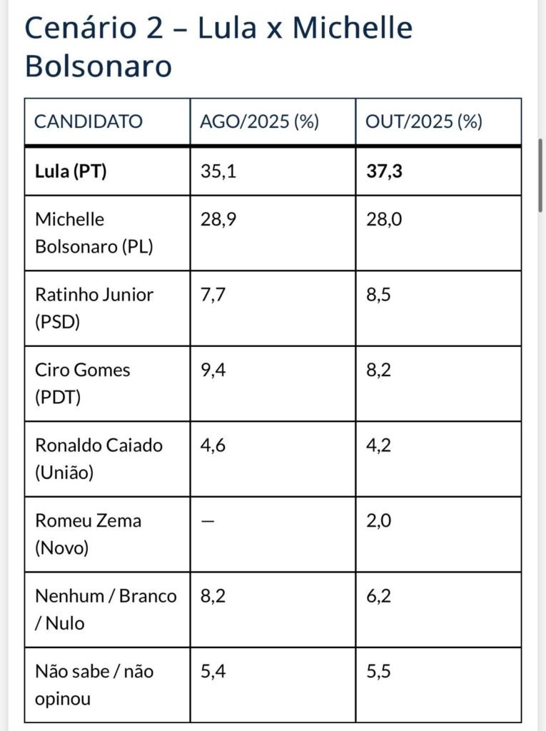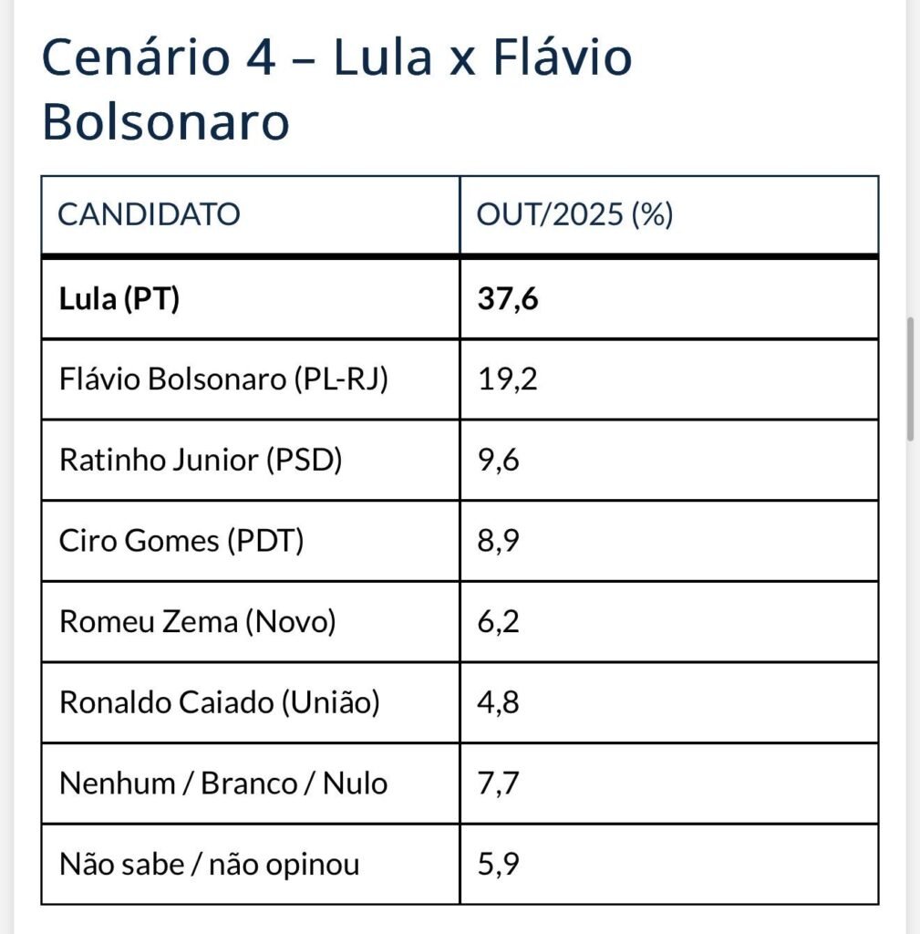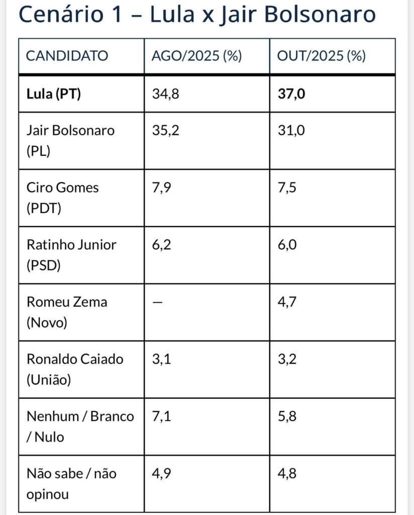 O levantamento confirma o favoritismo de Lula e a fragmentação do campo bolsonarista. Sem o ex-presidente na disputa, a direita se pulveriza, e nenhum nome isolado ultrapassa 25% da preferência.