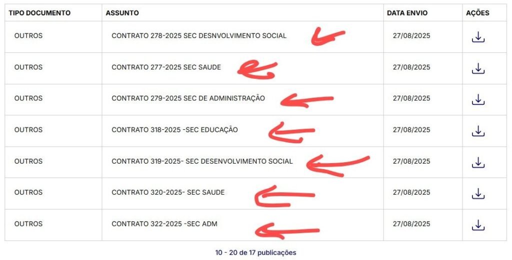 A situação fica ainda mais polêmica porque, após a homologação, o município publicou uma série de contratos associados ao mesmo pregão, distribuídos entre as secretarias de Saúde, Educação, Desenvolvimento Social e Administração, todos datados de 27 de agosto de 2025.