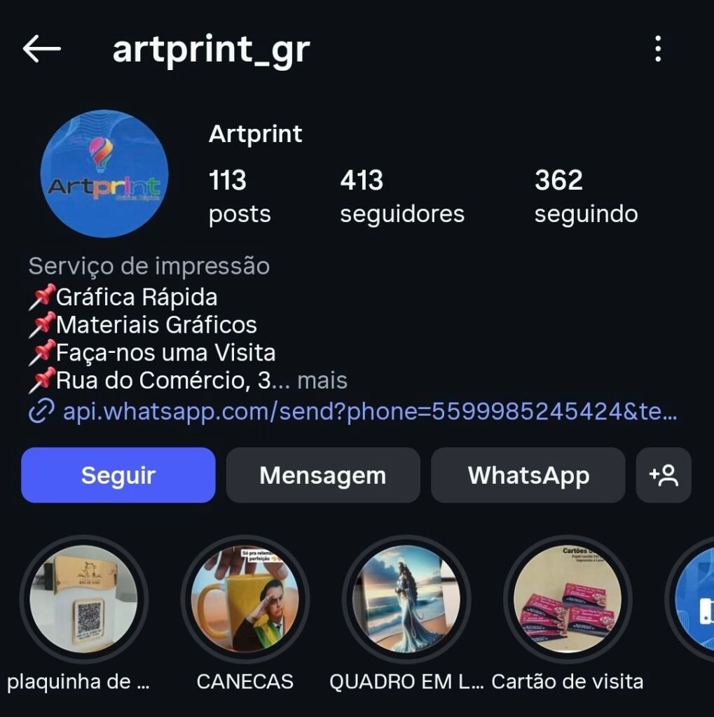A Artprint se apresenta como uma gráfica de pequeno porte, atuando em serviços como impressão rápida, cartões de visita, quadros, canecas e outros materiais personalizados – itens comuns em gráficas locais.
