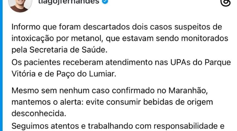 Read MoreA Secretaria de Estado da Saúde (SES) informou que foram descartados dois casos suspeitos de intoxicação por metanol, que estavam